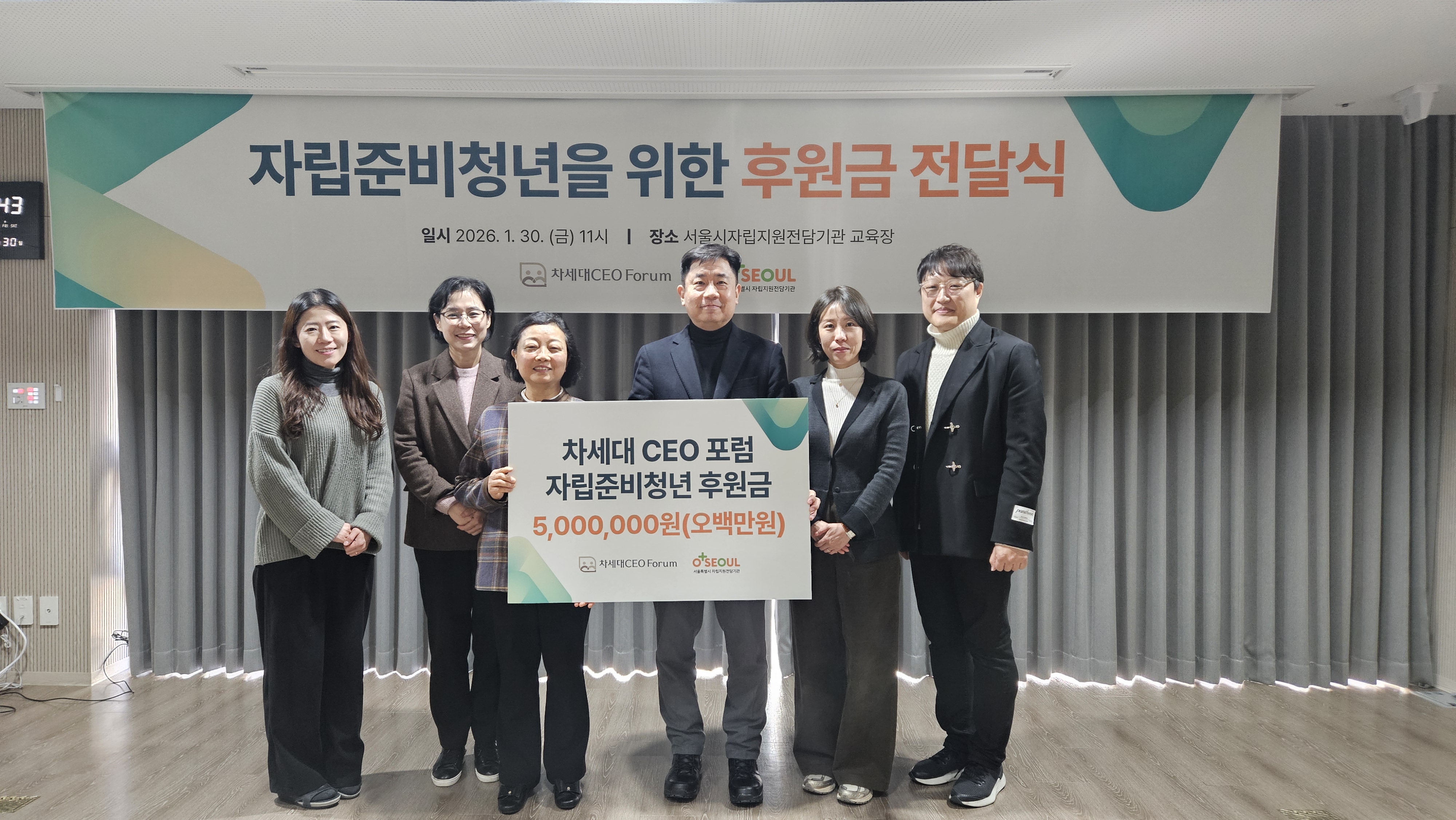 2026년 1월 30일(금), 서울시자립지원전담기관과 차세대CEO포럼의 따뜻한 후원금 전달식이 진행되었습니다.